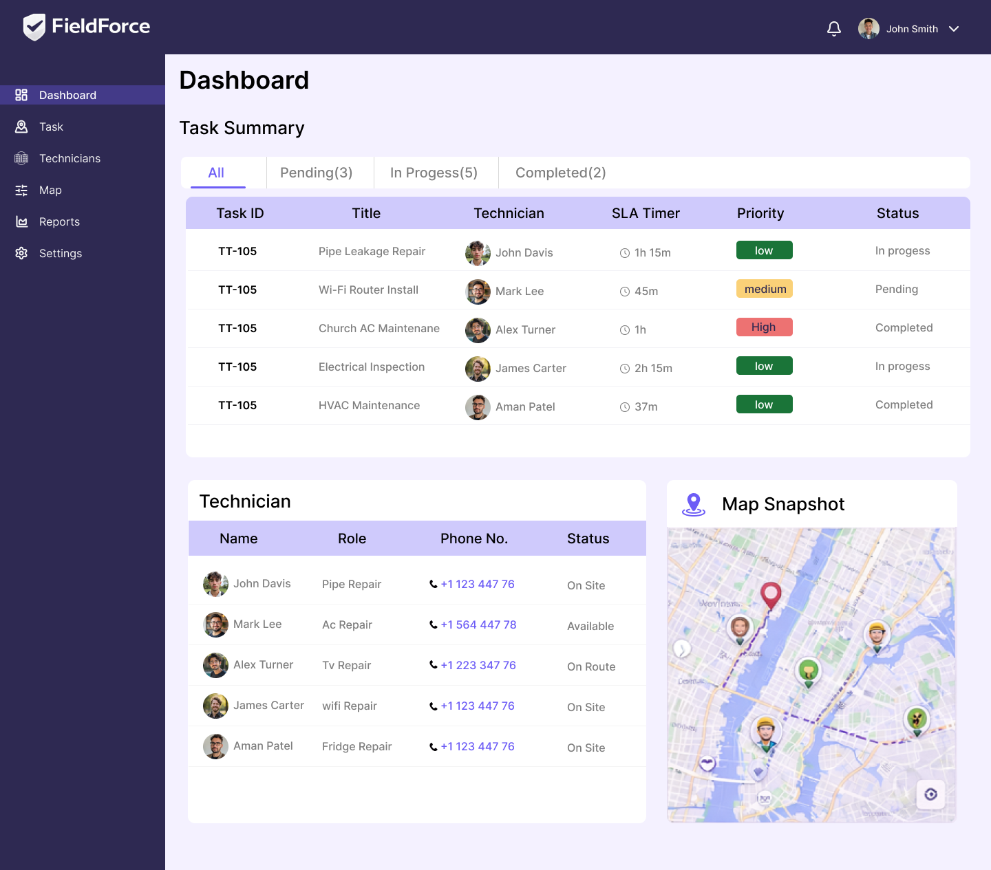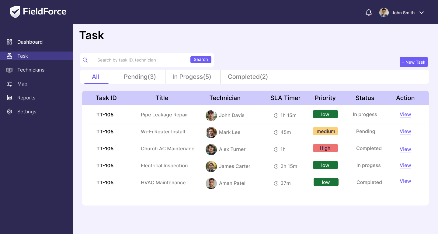 Assign tasks with priority, SLA, and deadlines to field teams.